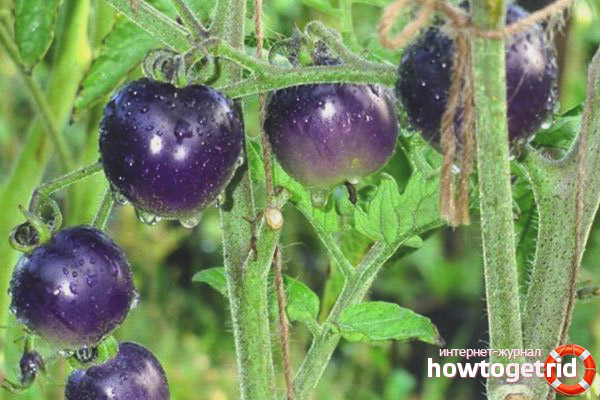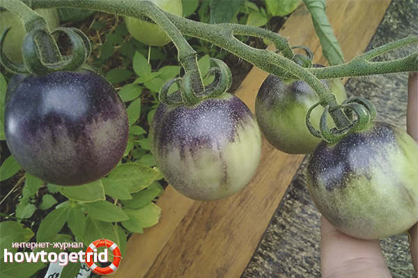 Unripe tomatoes can have a green or blue color, and after ripening they turn black or dark purple. The tomato has a fleshy juicy pulp and a dense skin.