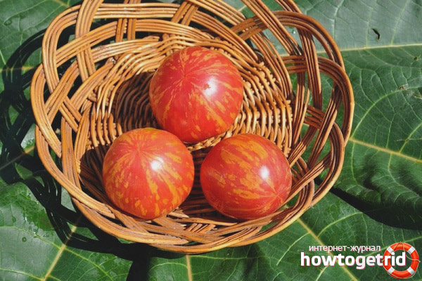 Reaching up to one and a half meters, the stem is cut off. Additional garter of each branch is required. On one color brush, up to 6 tomatoes are tied. All have a smooth and rounded shape. Striped peel. Tomatoes are sweet in taste with a slight sour flavor. Up to four bushes are planted per square meter. Accordingly, from such an area, on average, you can collect up to 60 kilograms of ripe, tasty and unusual fruits.