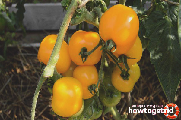 The shape of the fruit is round, the skin is even and smooth. When ripe, the tomatoes acquire a saturated yellow color. The average weight of one fruit is from 50 to 70 grams. The taste of tomatoes is sweetish. The pulp is dense and juicy. Tomatoes contain carotene and a large amount of sugars. The yellow fruit variety is used for fresh consumption and for pickling. Due to the dense pulp and durable skin, the fruits do not crack during heat treatment. From one bush you can collect 2-3 kg of ripe tomatoes.