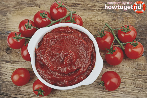 The content of the product is characterized by a large number of representatives of the organic acid series. This causes an irritating effect on the mucous membrane of the stomach and intestines. People who have problems in this regard, after they eat a dish with tomato paste, may experience heartburn.