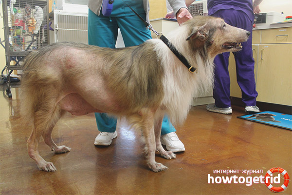 - Hypotheriosis. With a deficiency in the body of the pet of thyroid hormones - hypothyroidism occurs. In this case, a lethargic state of the dog is noted. There is a decrease in immunity, which, in turn, leads to a loss of body resistance to infectious diseases. This accompanies the thinning of the hair, with its subsequent thinning in the chest and neck, then the back and sides, tail, and thighs undergo baldness.