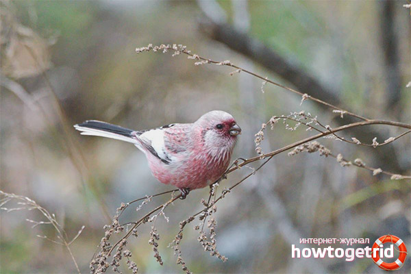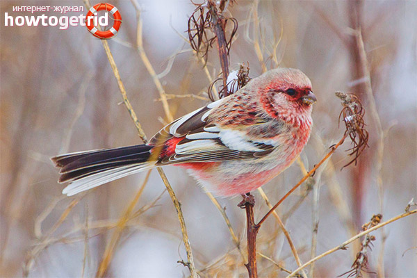 These birds are quite easy to distinguish from others. This is especially true of males. They have a bright plumage. In particular, they stand out in the winter against the backdrop of snow. On the head and neck, the plumage is painted in a reddish color. The tail and wings have contrasting plumage in a combination of black and white. Small silver spots are visible on the chest and head of the hurragus.