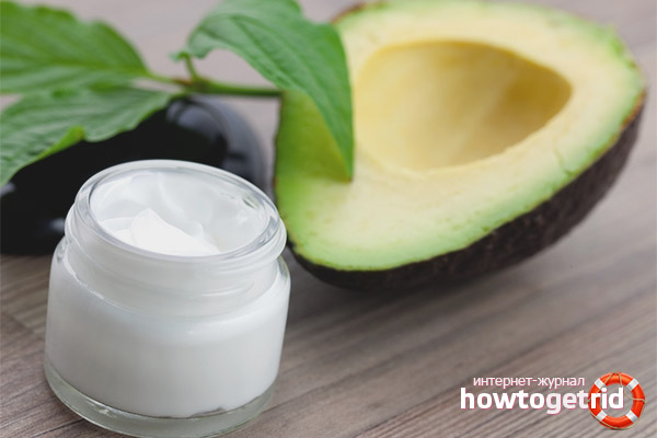 - Turn avocados into slurry in any way possible. Introduce 12 ml. peach oil and 30 gr. cream. Stir the ingredients until a homogeneous composition is formed. Distribute the product on problem areas of the skin.