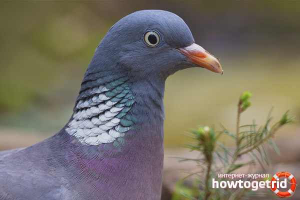 - We continue the description. The eyes are round-shaped birds with black pupils. On the circumference of the pupils there is a rim of a reddish undertone. The beak is curved, strong, pigmented with a reddish color at the base. The tip is yellow. There is a silver sheen on the curved gray-green neck. A distinctive feature of forest pigeons is the presence of bright spots on both sides of the neck.