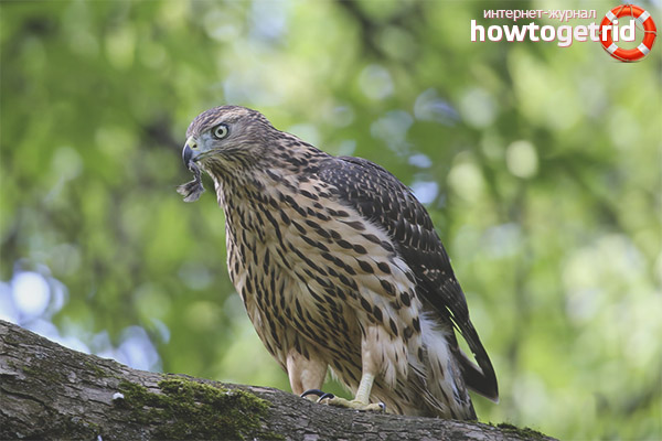 As usual, the hawk plucks the caught prey, sometimes without even killing it, but if at this moment he is disturbed by something, the predator will leave an unfortunate prey. Usually this bird settles with prey on a small hill, and as a result of the meal, feathers, bones, beak, claws and a bird's skull remain at the place of the meal.