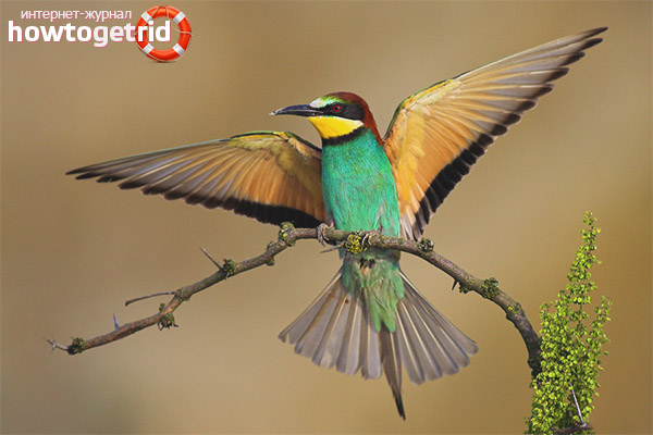 If golden bee-eater settled down near the location of the apiary, then bees will become their main prey. One bee family consists of about 30 thousand individuals, an adult bee-eater is capable of destroying up to 2% of the population of this family per day. During the summer, a pair of bee-eater exterminates about 2,000 insects. And if a flock of bee-eater is located next to an apiary consisting of 50 families, then the income of this apiary will be reduced to 0.